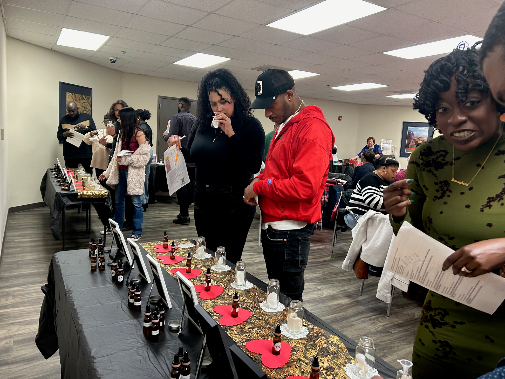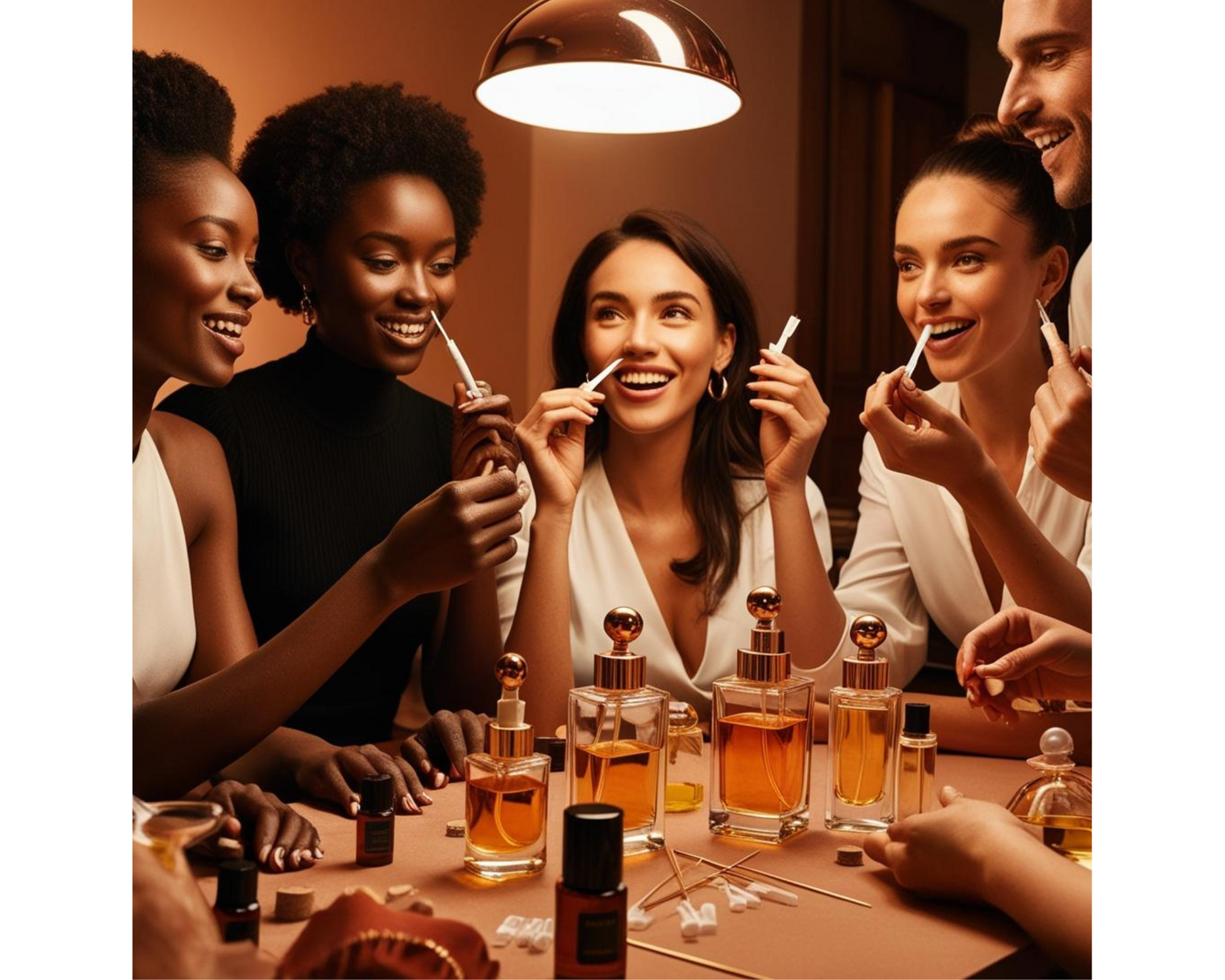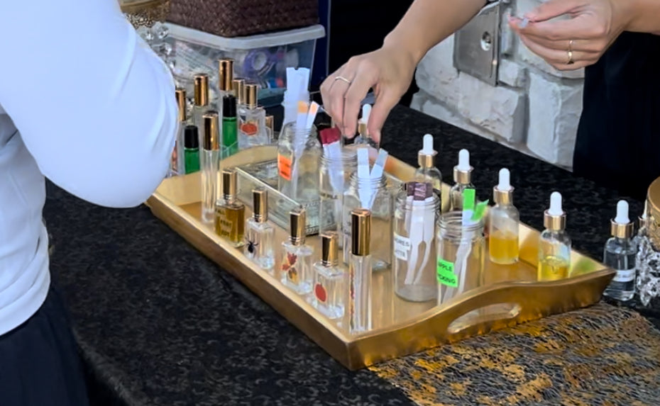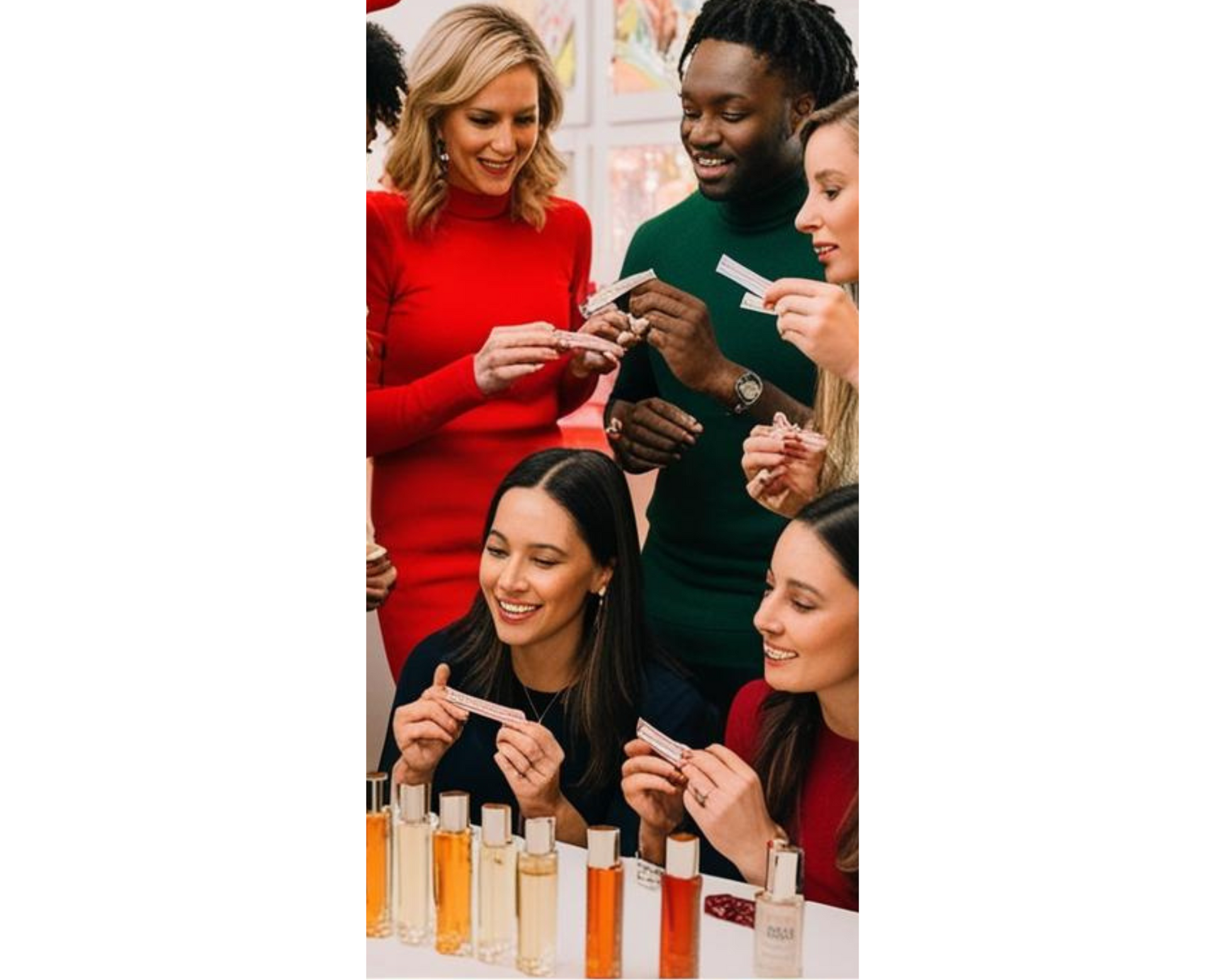 Using professional scent strips, guests mix and match fragrances to find their perfect combination through personalized one-on-one consultation. It's like creating a custom playlist, but for your nose! Our fragrance curator guides each person individually to discover what truly speaks to them. (For larger events, we provide multiple stations with additional trained staff to ensure everyone receives personal attention.)