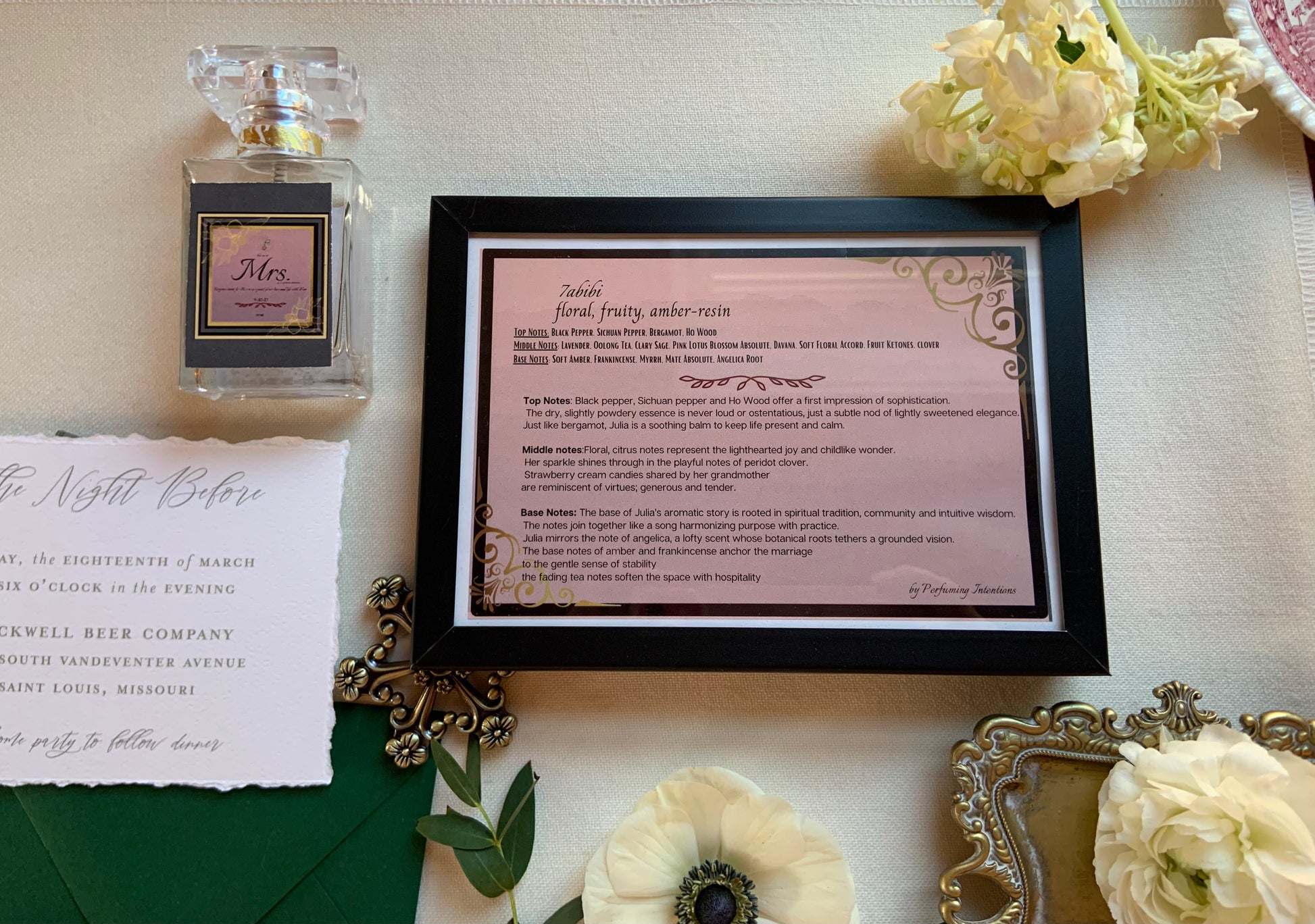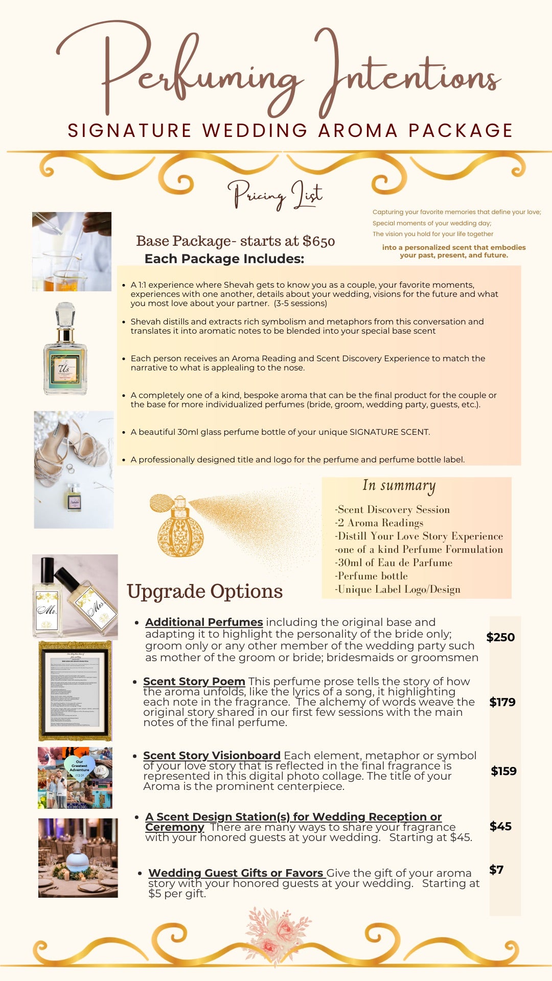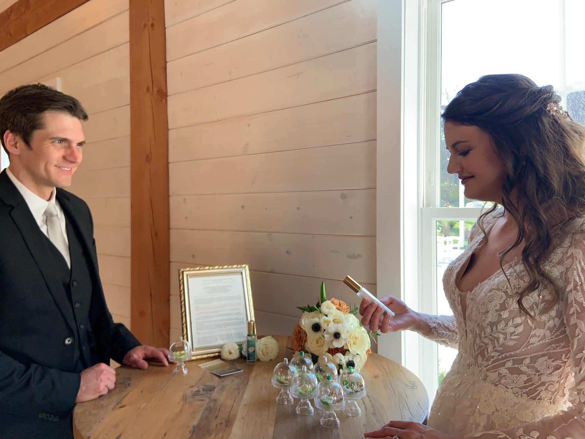 - A completely one of a kind, bespoke aroma that can be the final product for the couple or the base for more individualized perfumes (bride, groom, wedding party, guests, etc.).